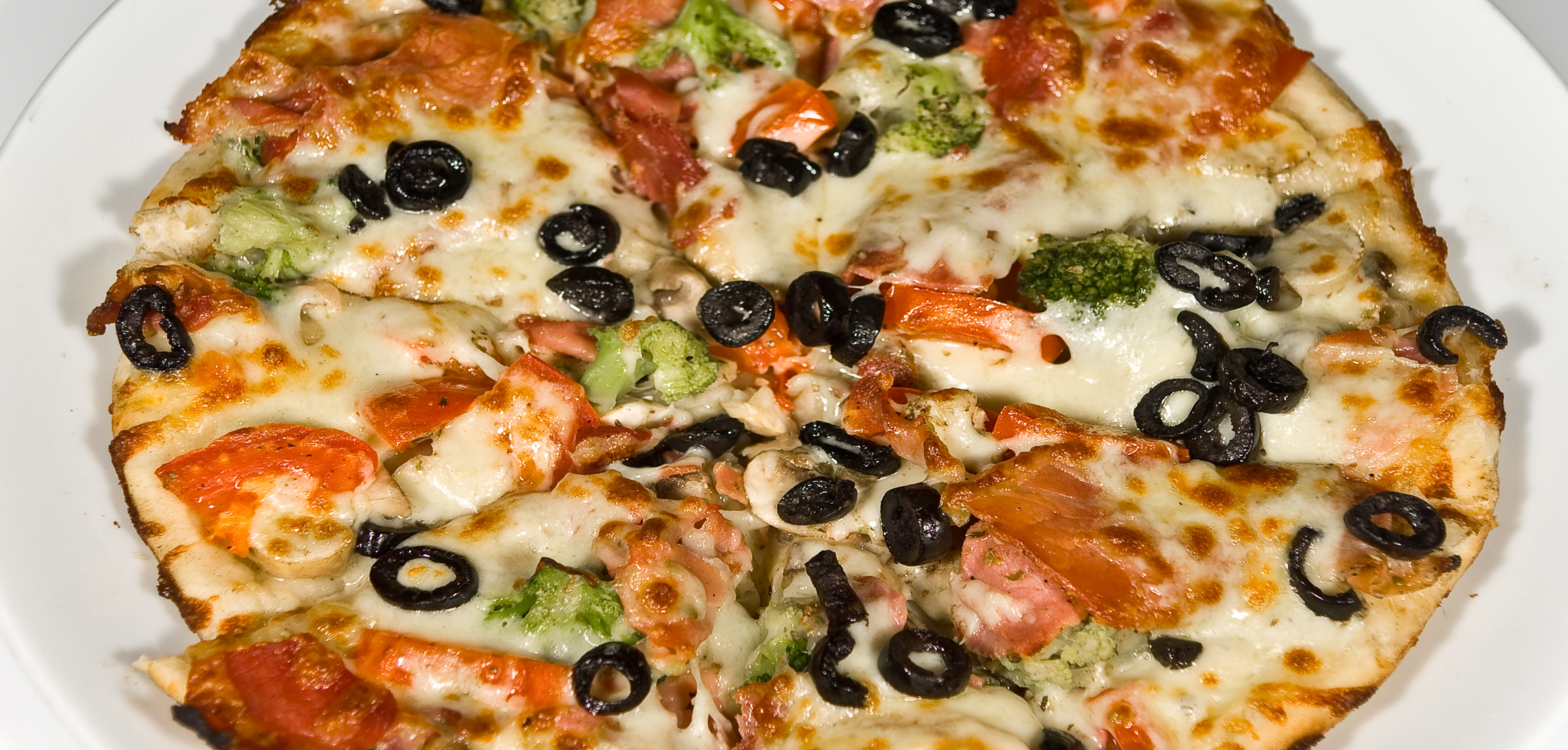 blat pizza cu lapte de vacă, mozzarella, prosciutto, ciuperci proaspete, roşii, broccoli, măsline negre felii, ulei de măsline, piper, oregano