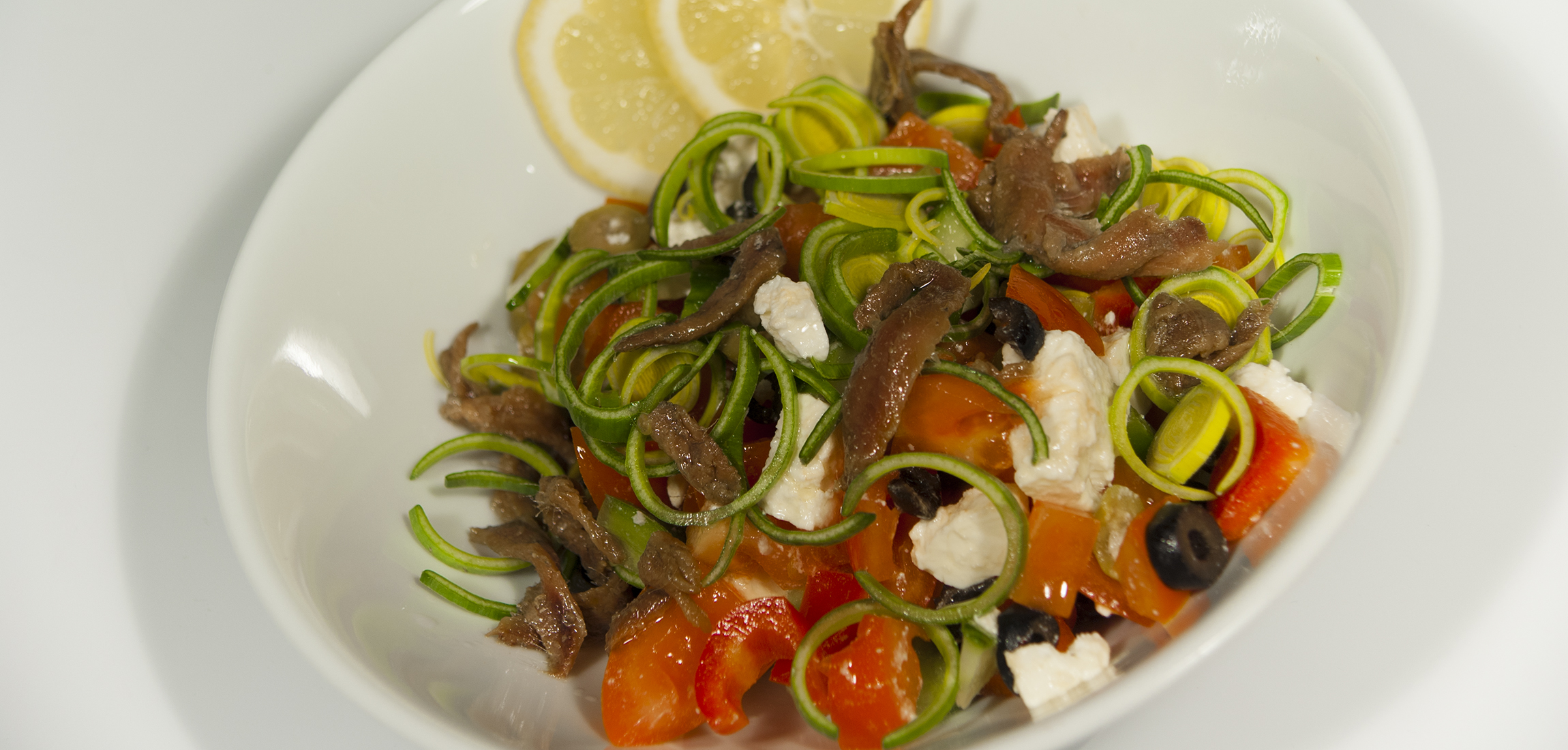 roşii, ardei gras, castraveţi, telemea, file anchois, măsline negre, măsline verzi, ceapă, lămâie, ulei de măsline, piper